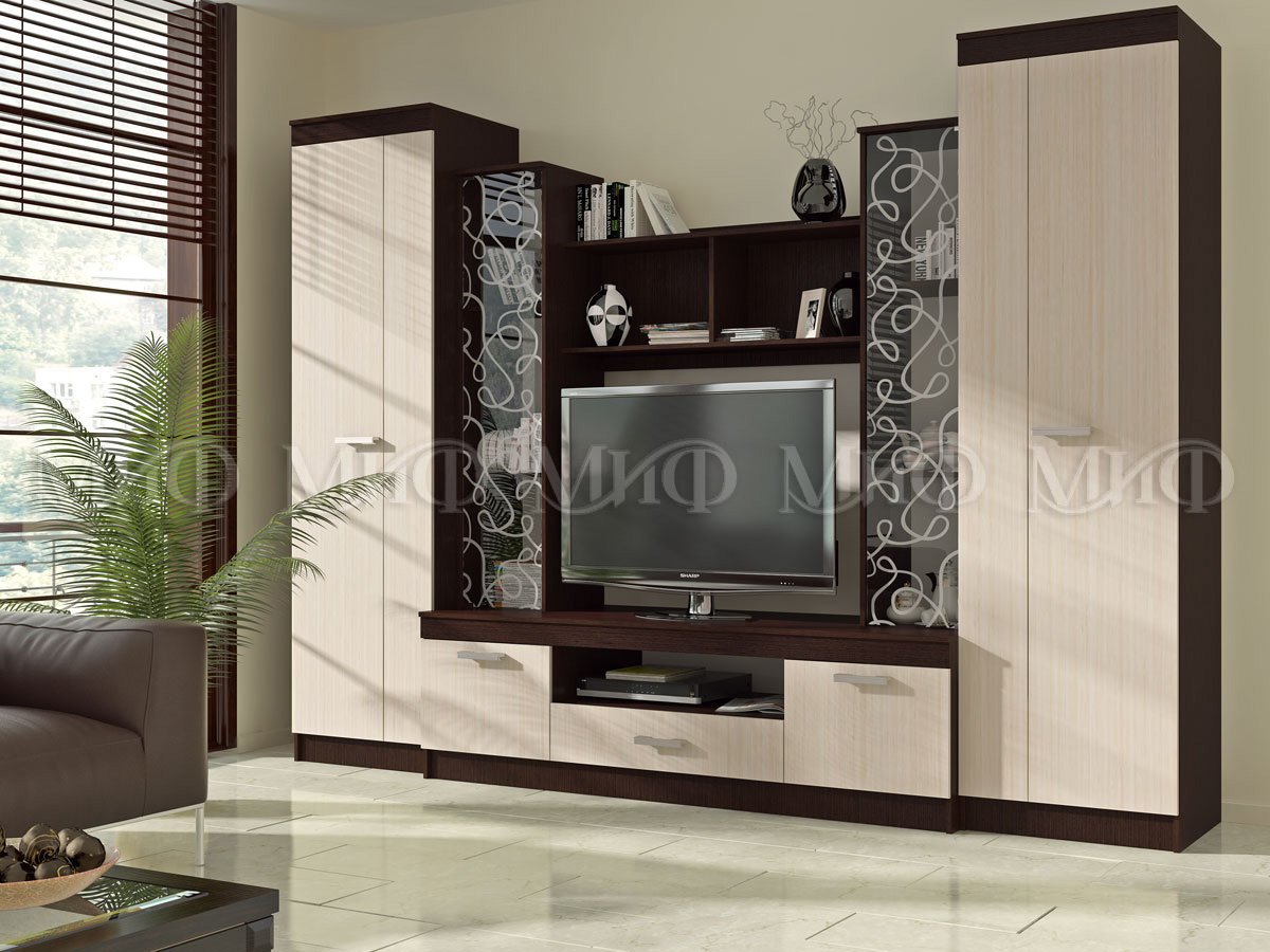 Настоящее украшение модели – центральные шкафы-витрины с нанесенным на стекло фантазийным рисунком. Красивая гостиная для стильного интерьера и практичного выбора.