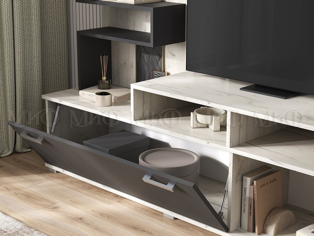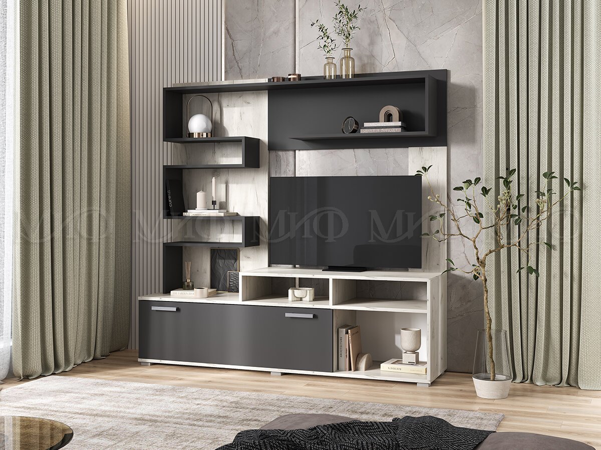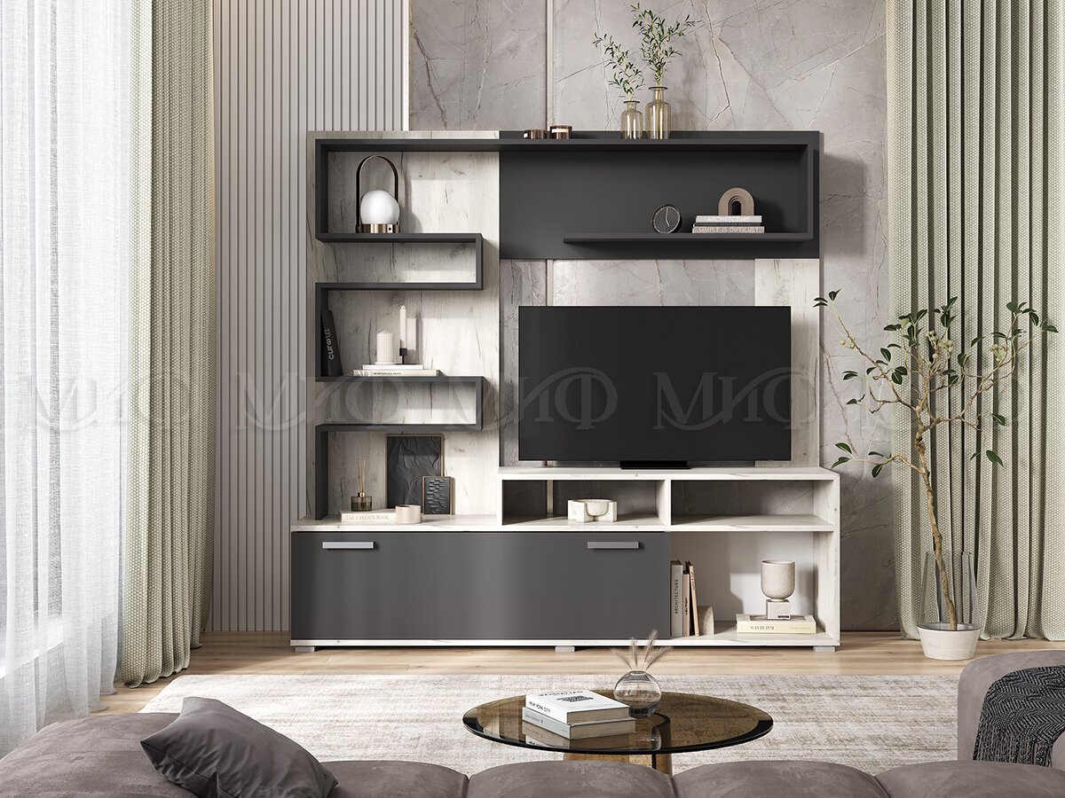 Воплощает в себе элегантность и функциональность. Красивая и асимметричная, она выглядит весьма эффектно. Основное предназначение – установка видео-аудио техники. Для современной гостиной в классическом стиле.