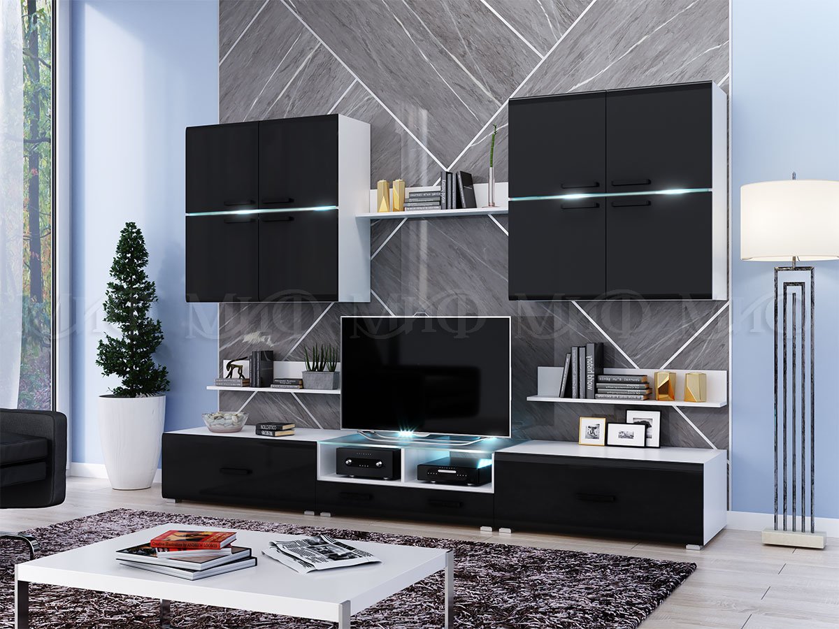 Цветовая гамма гостиной «Квадро» выделяет мебельную конструкцию ярким пятном на стене. Глянец и стекло придают помещению изысканности и воздушности интерьера. Современная гостиная «Квадро» — идеальное решение для любой квартиры.