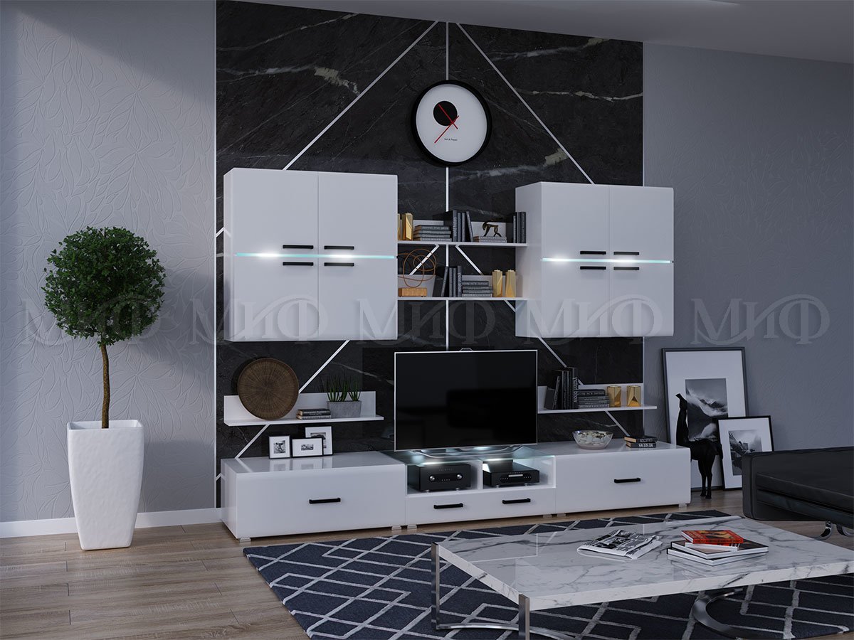 Цветовая гамма гостиной «Квадро» выделяет мебельную конструкцию ярким пятном на стене. Глянец и стекло придают помещению изысканности и воздушности интерьера. Современная гостиная «Квадро» — идеальное решение для любой квартиры.
