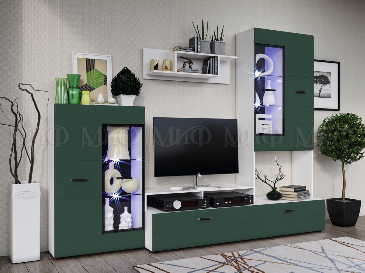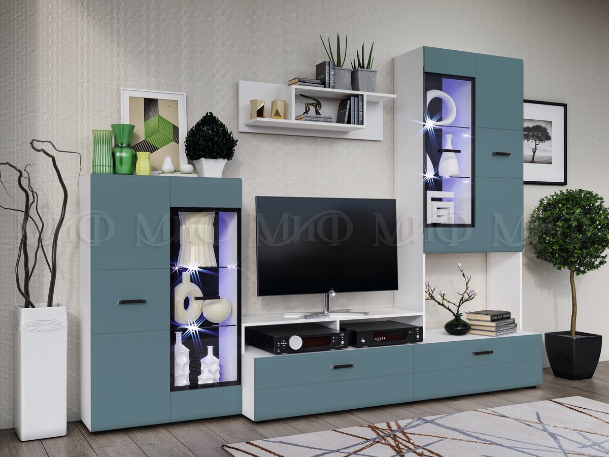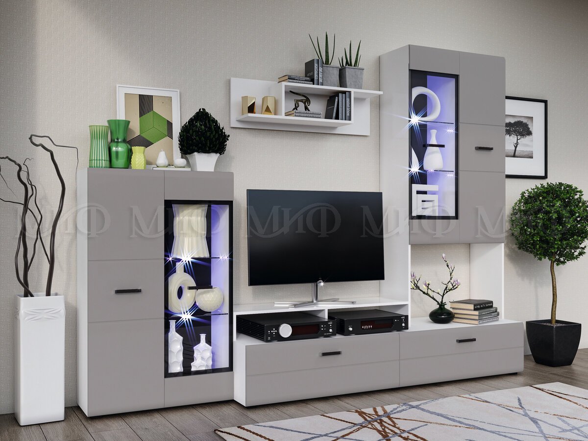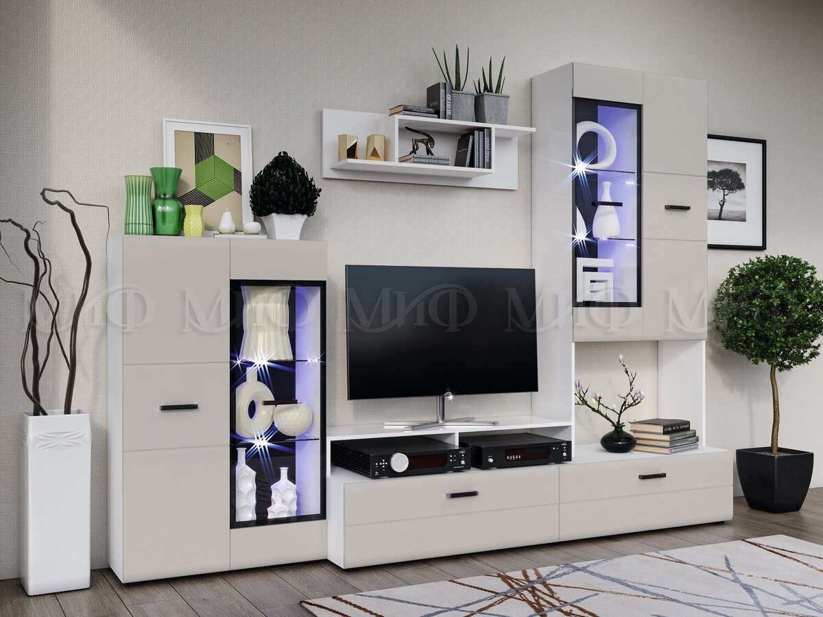 Изысканная, белоснежная с приятным блеском гостиная, несомненно украсит собой любую квартиру или дом. В гостиной есть все необходимые элементы для красивого оформления комнаты. Фасады с фрезеровкой и стеклянные витрины создают современный и стильный образ вашему дому.