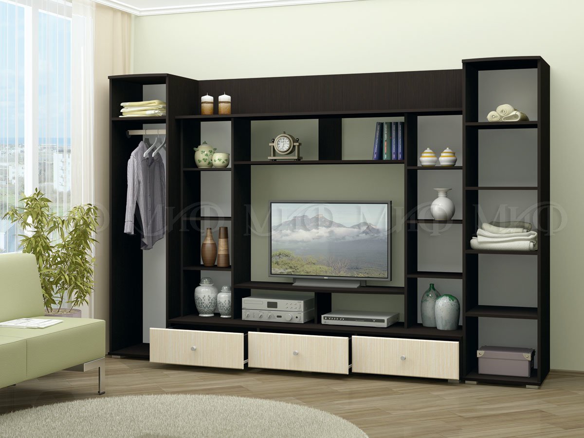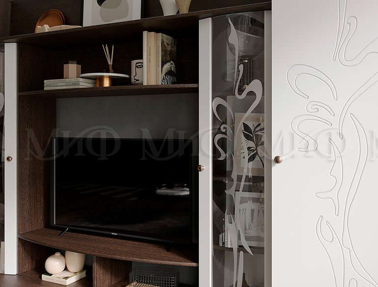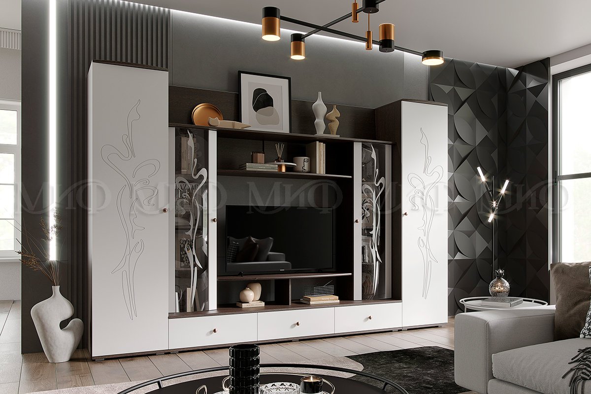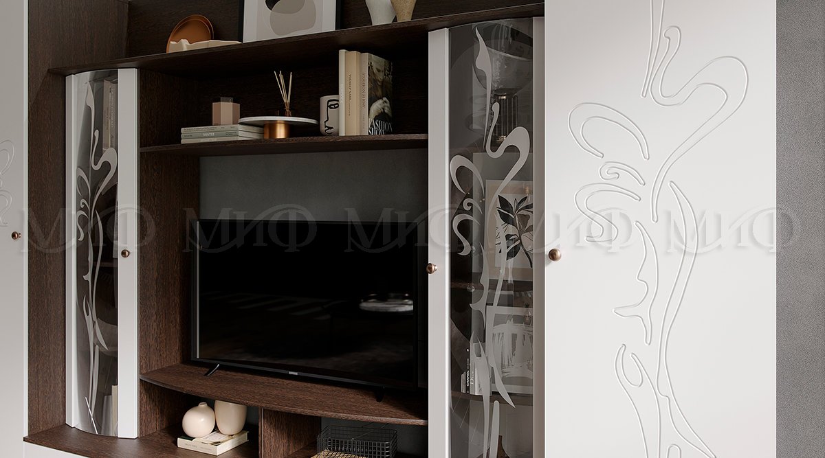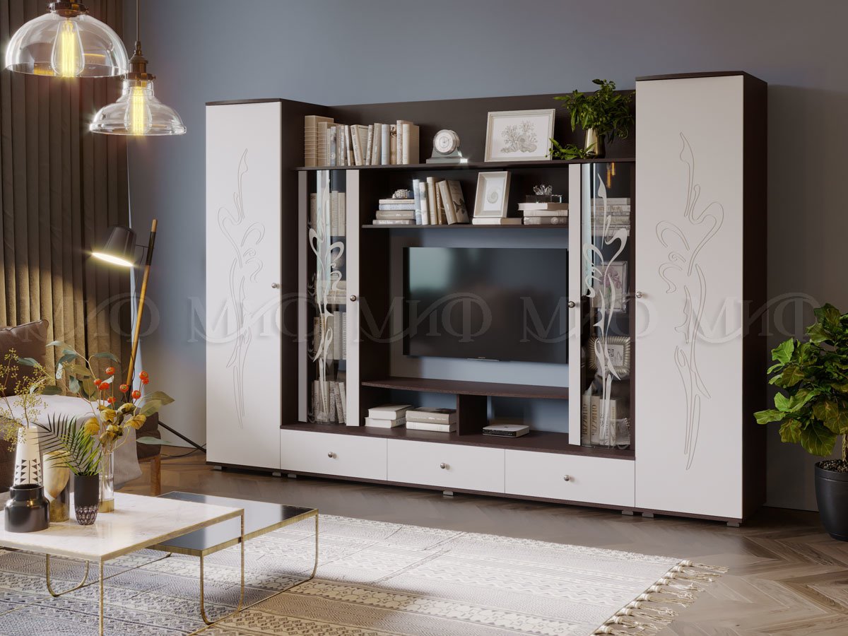 Стенка "Орхидея" - классическая мебель для гостиной, в модном, богатом дизайне. Вертикальные витрины, оснащенные гнутыми тонированными стеклостворками, придают модели изысканности. Фасады шкафов декорированы рисунком.