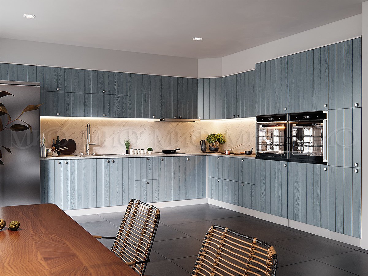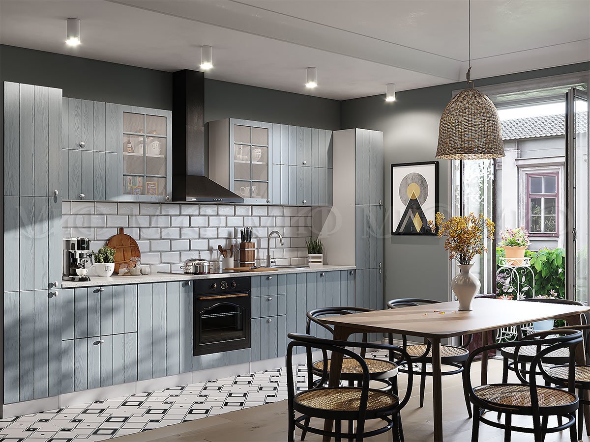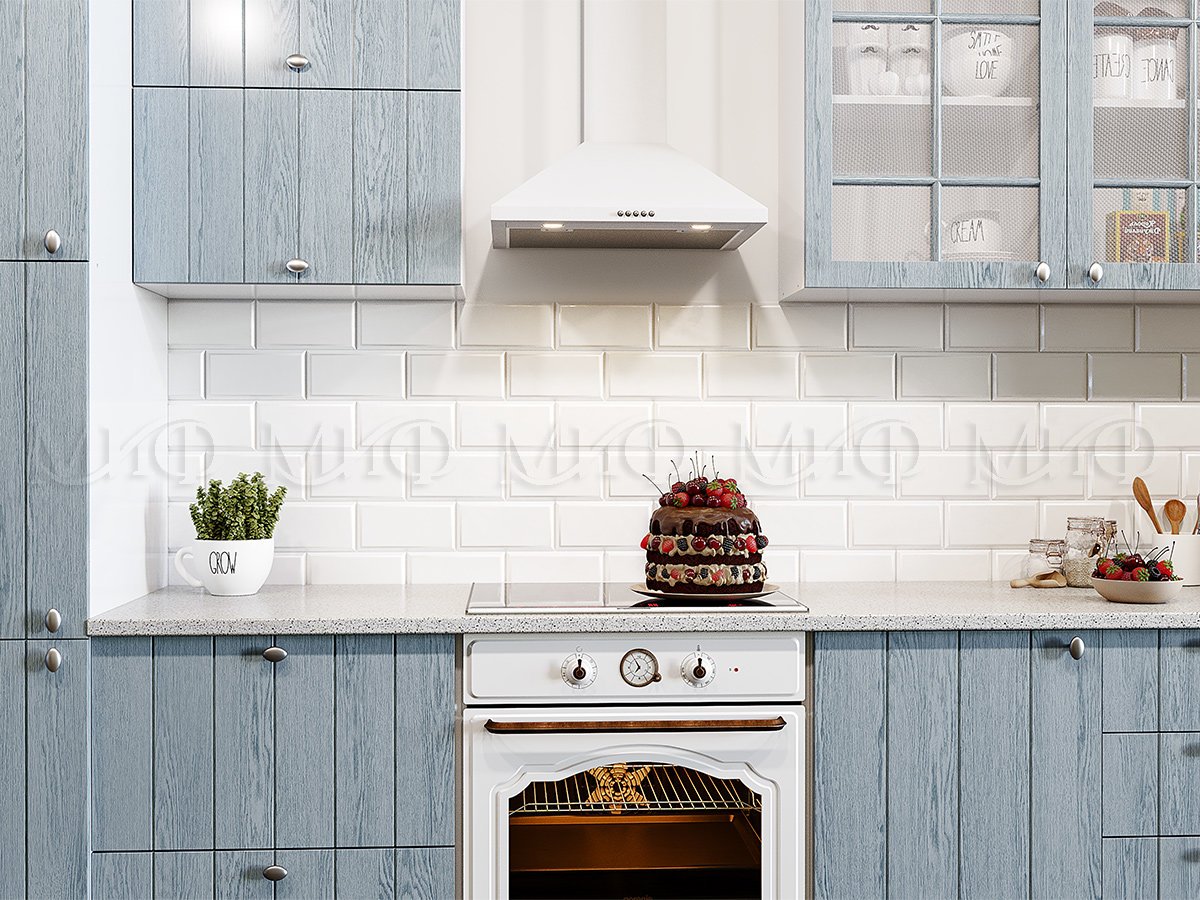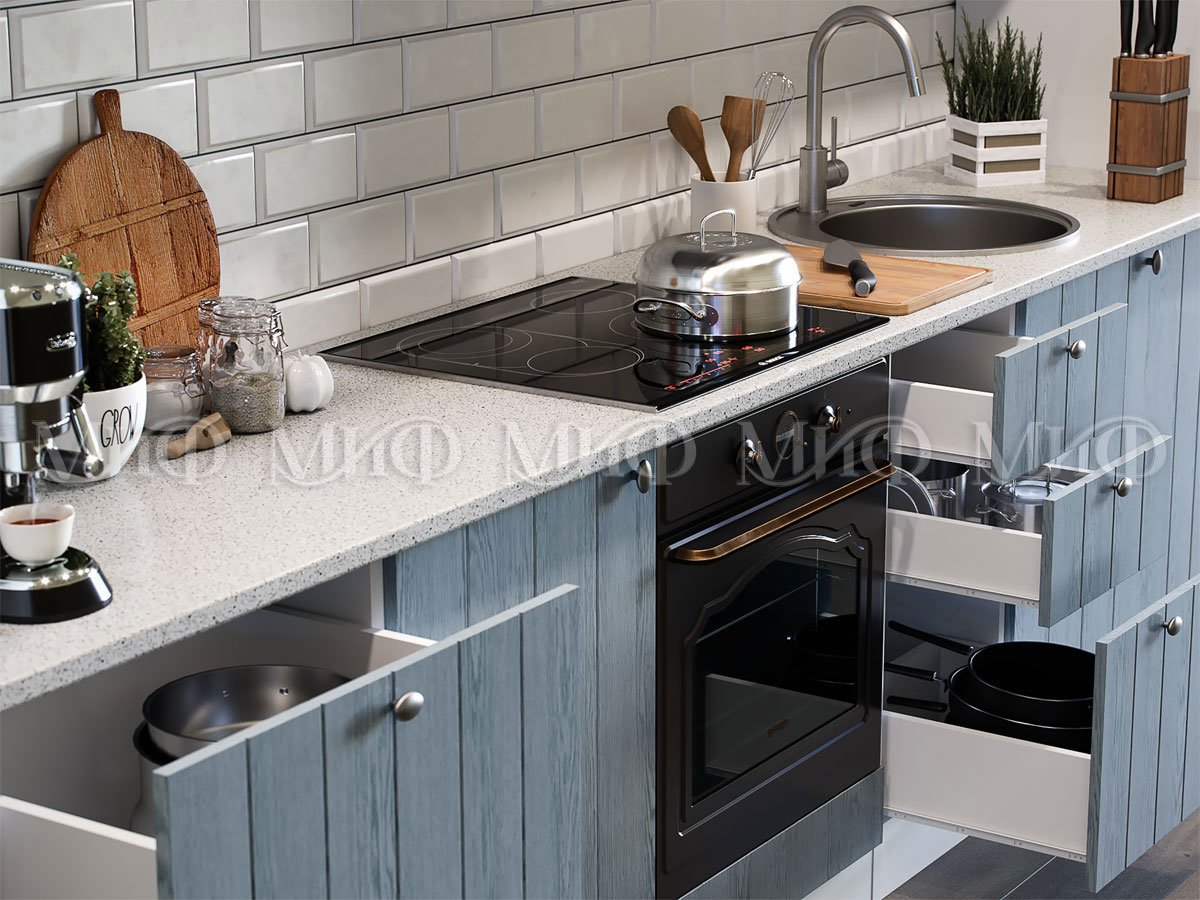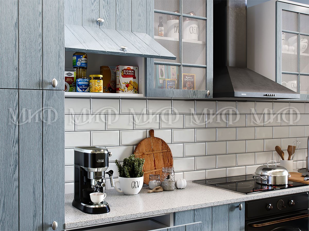 Серо голубые фасады "Техно-1" не раздражают и не надоедают, а функциональность шкафов позволяет максимально использовать пространство. Эта элегантная кухня прекрасно подойдёт для оформления небольших помещений, так как зрительно расширяет пространство.