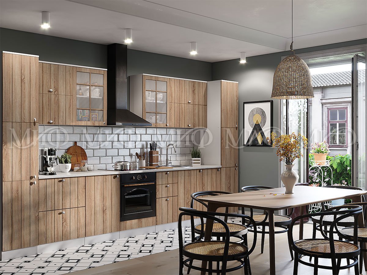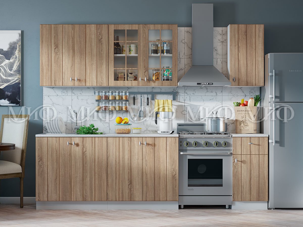 Фасады "Техно-1" не раздражают и не надоедают, а функциональность шкафов позволяет максимально использовать пространство. Эта элегантная кухня прекрасно подойдёт для оформления небольших помещений, так как зрительно расширяет пространство.