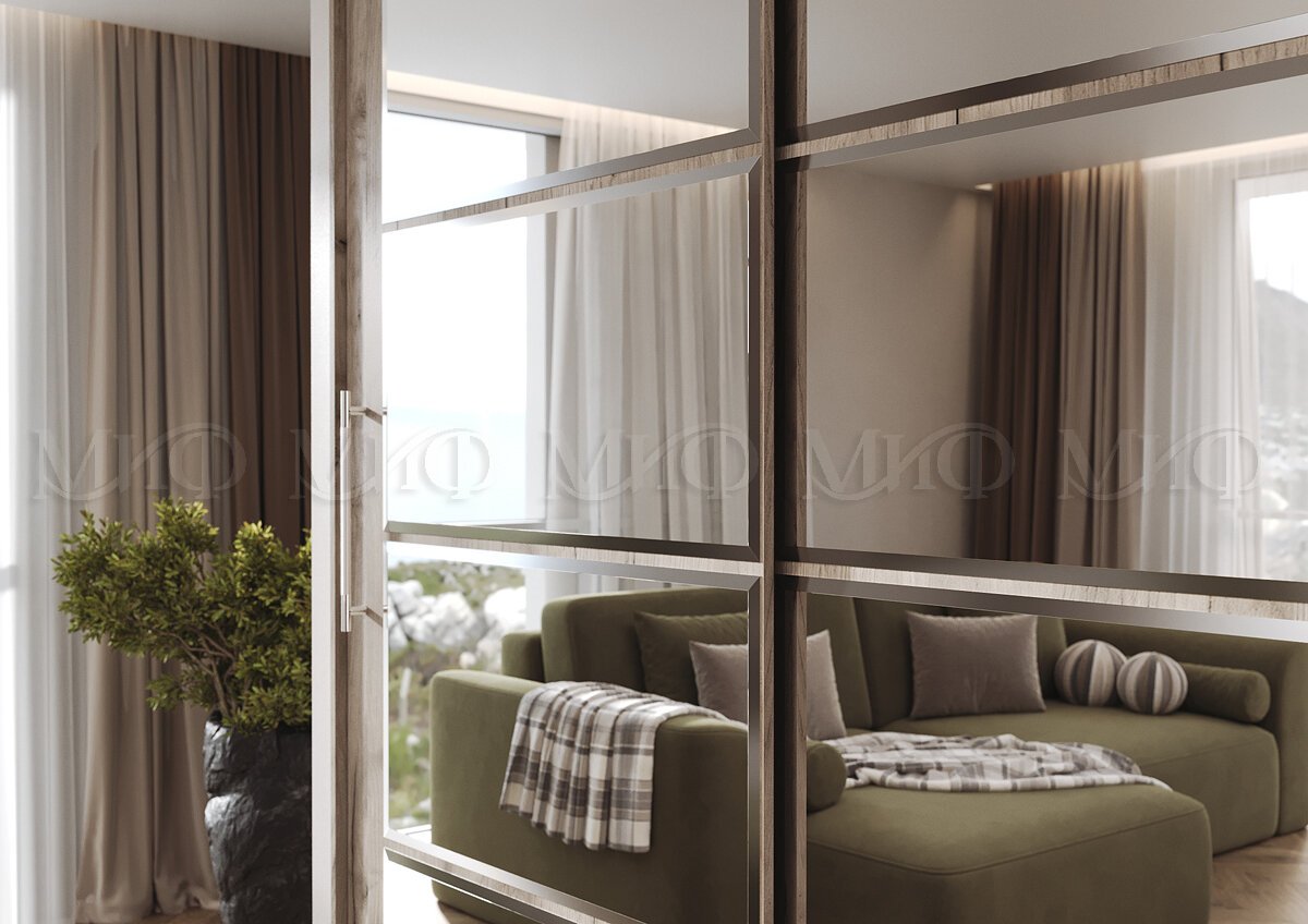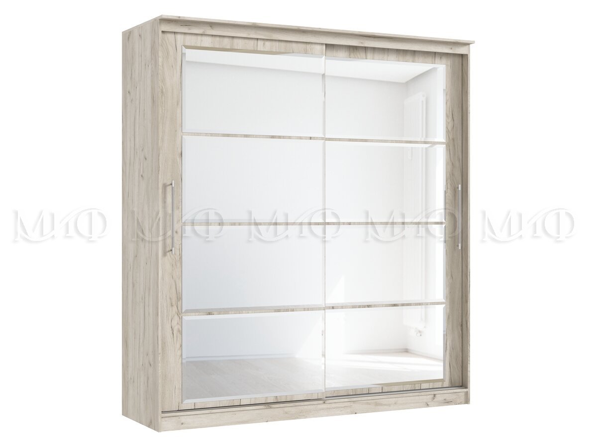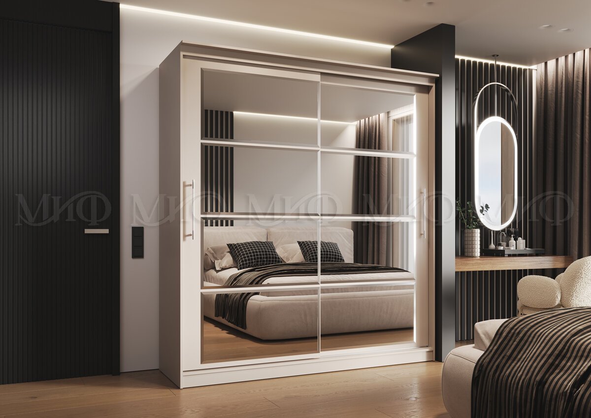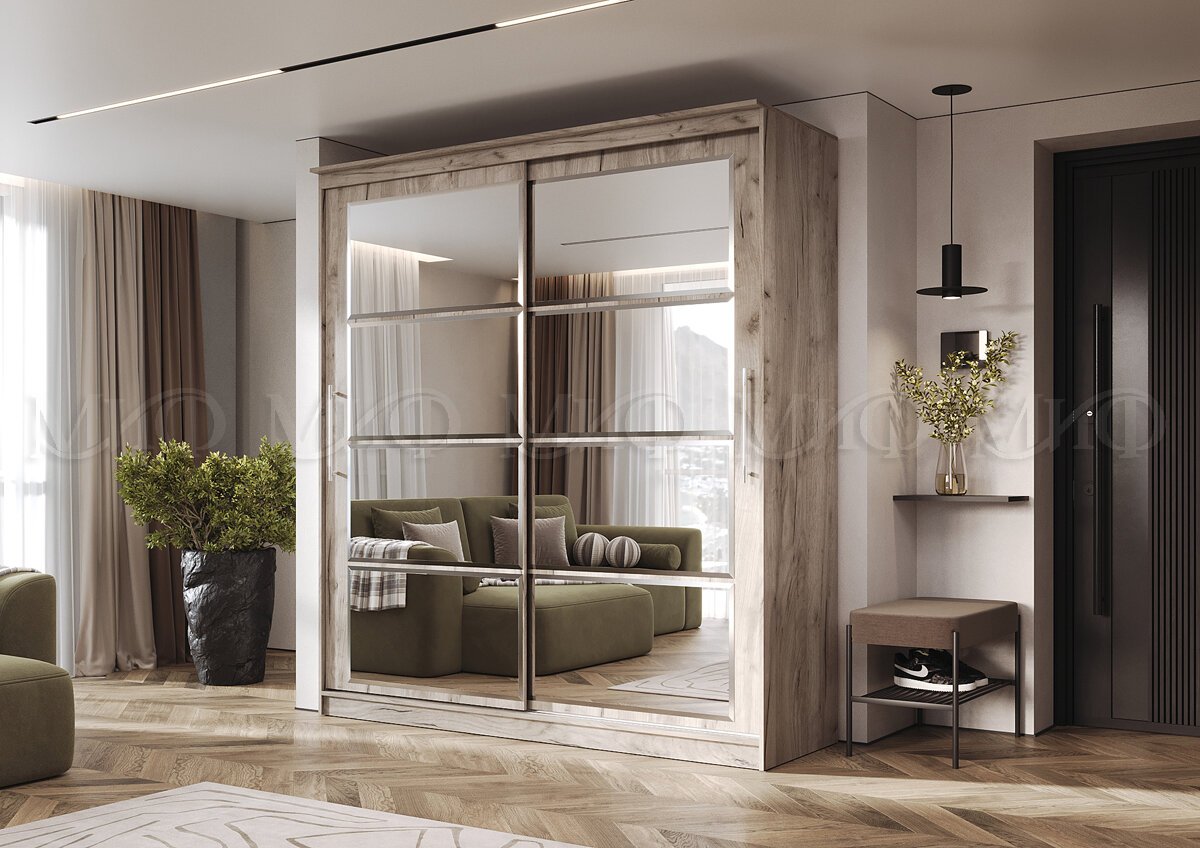 Элегант - шкаф купе с двумя дверями. Оригинальный дизайн фасада делает его весьма привлекательным. Зеркала, занимая практически всю площадь раздвижных дверей, скрадывают габариты шкафа, зрительно расширяют помещение.