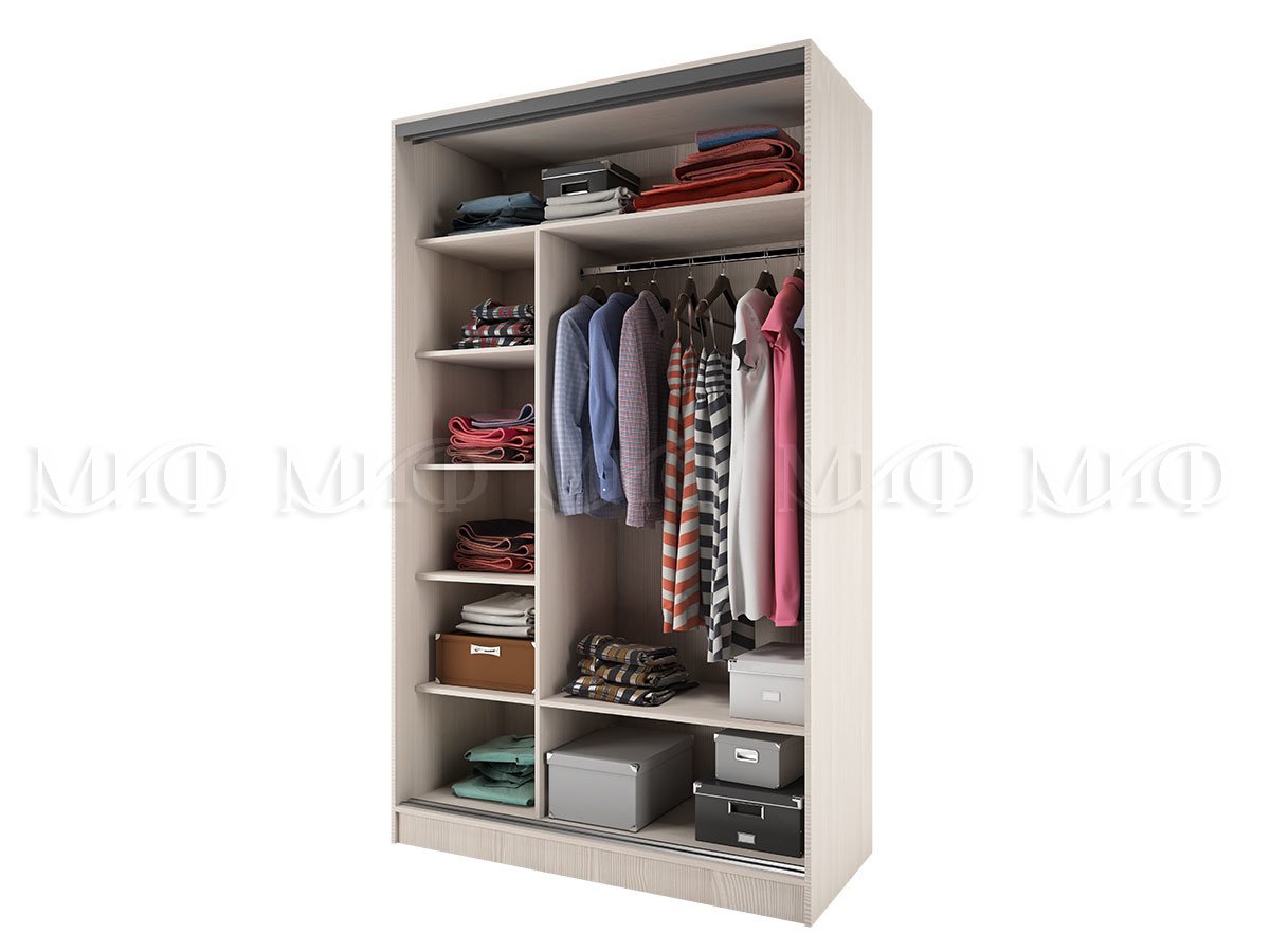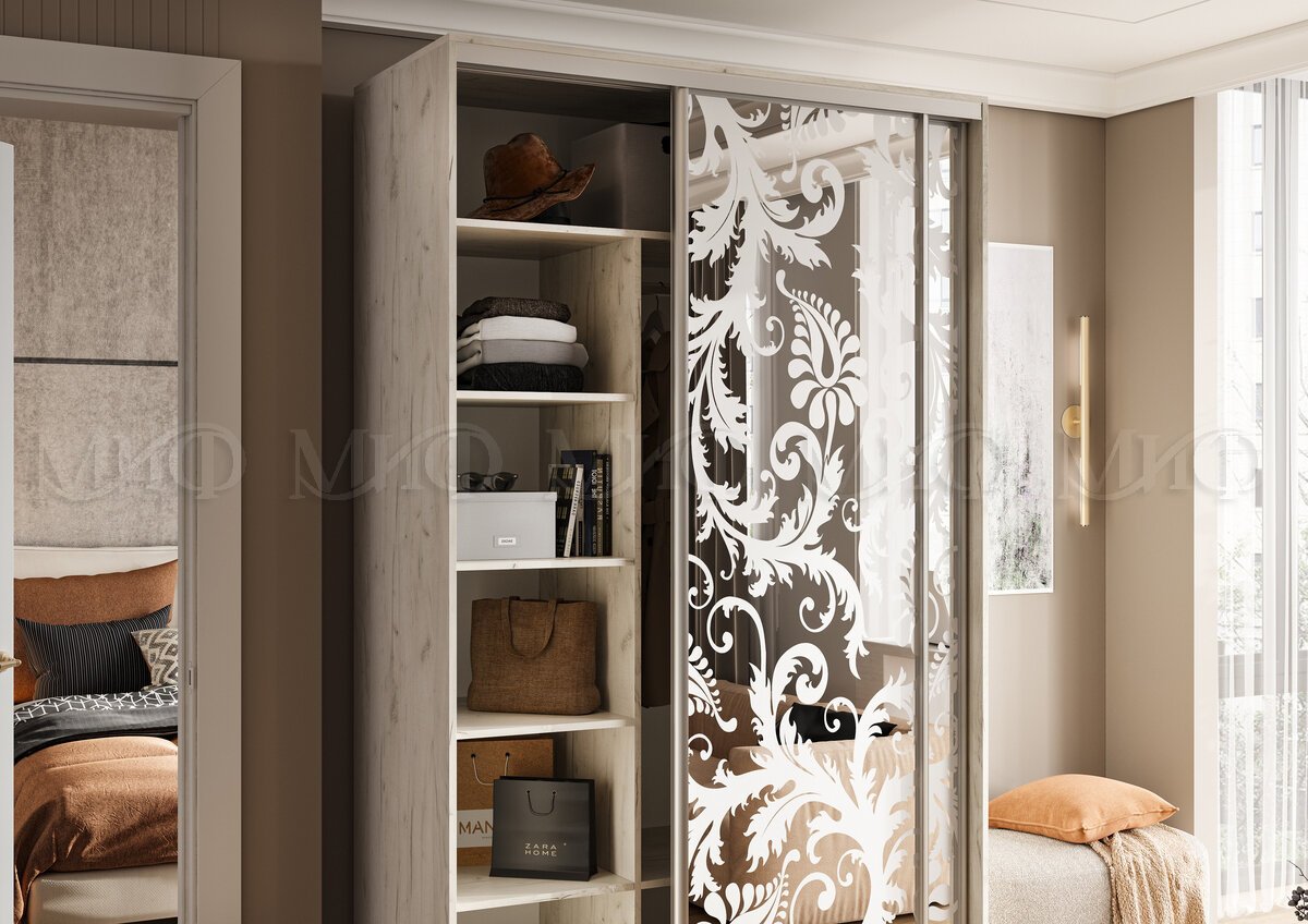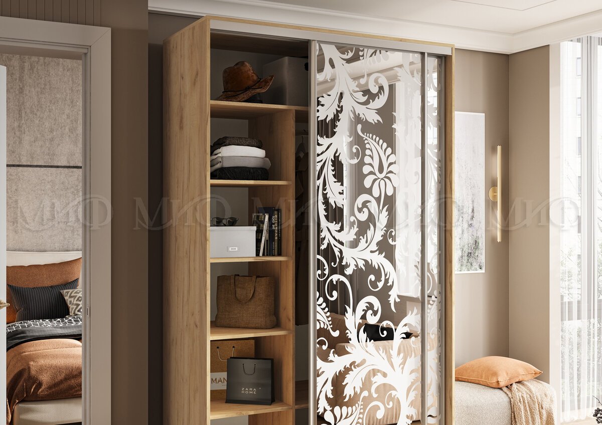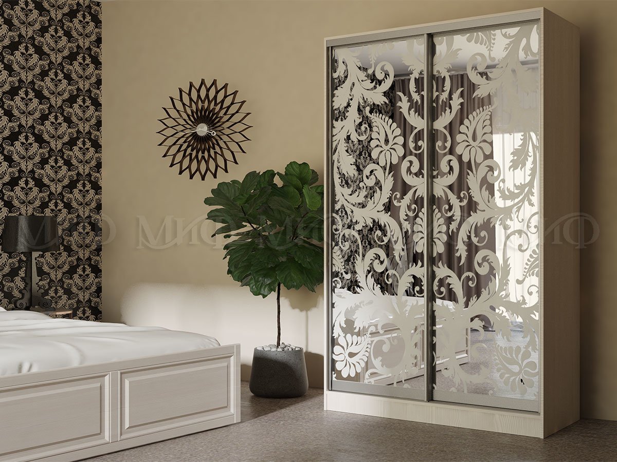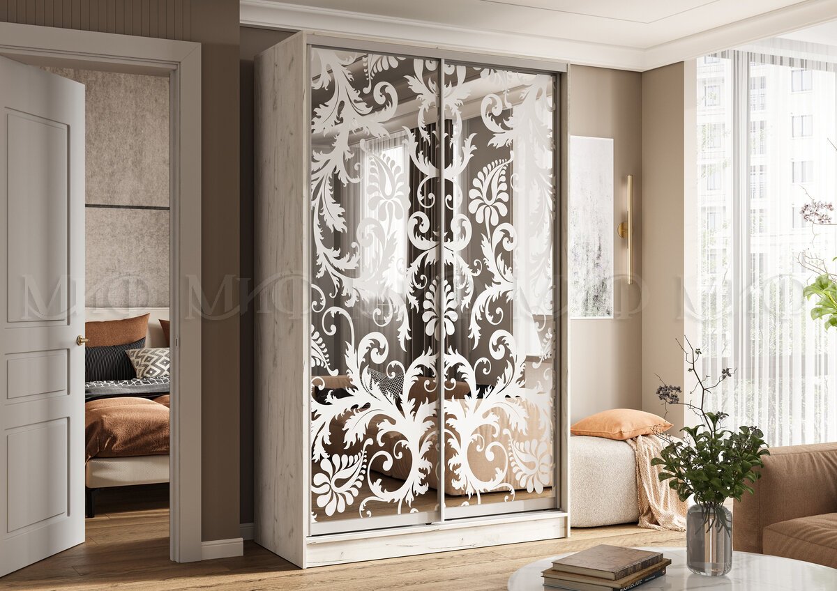 Прекрасная модель шкафа - купе "Шкаф-купе Тринити 3 (1,35 м)" с полками, штангой и насыщенным рисунком на зеркале украсит вашу квартиру и дополнит интерьер особым шармом.