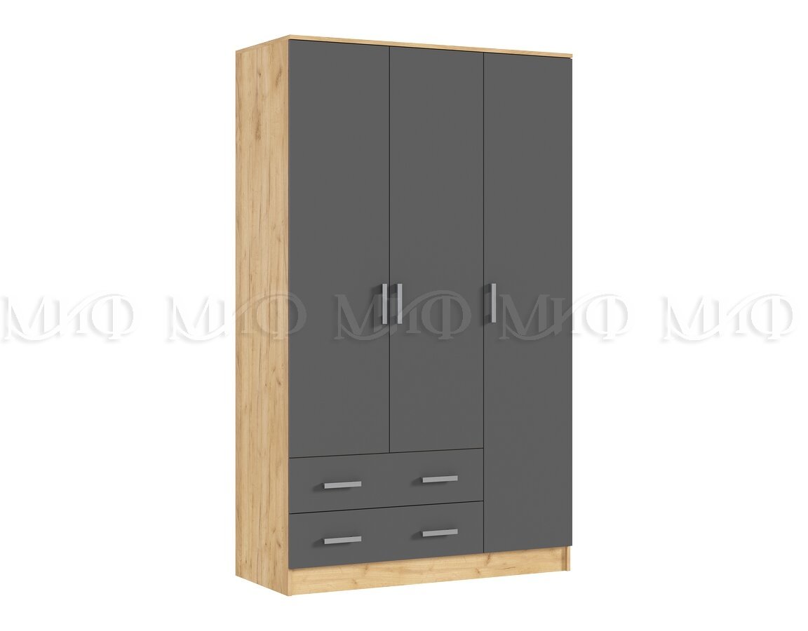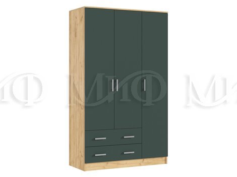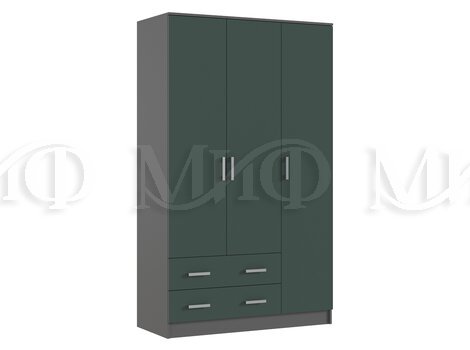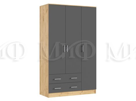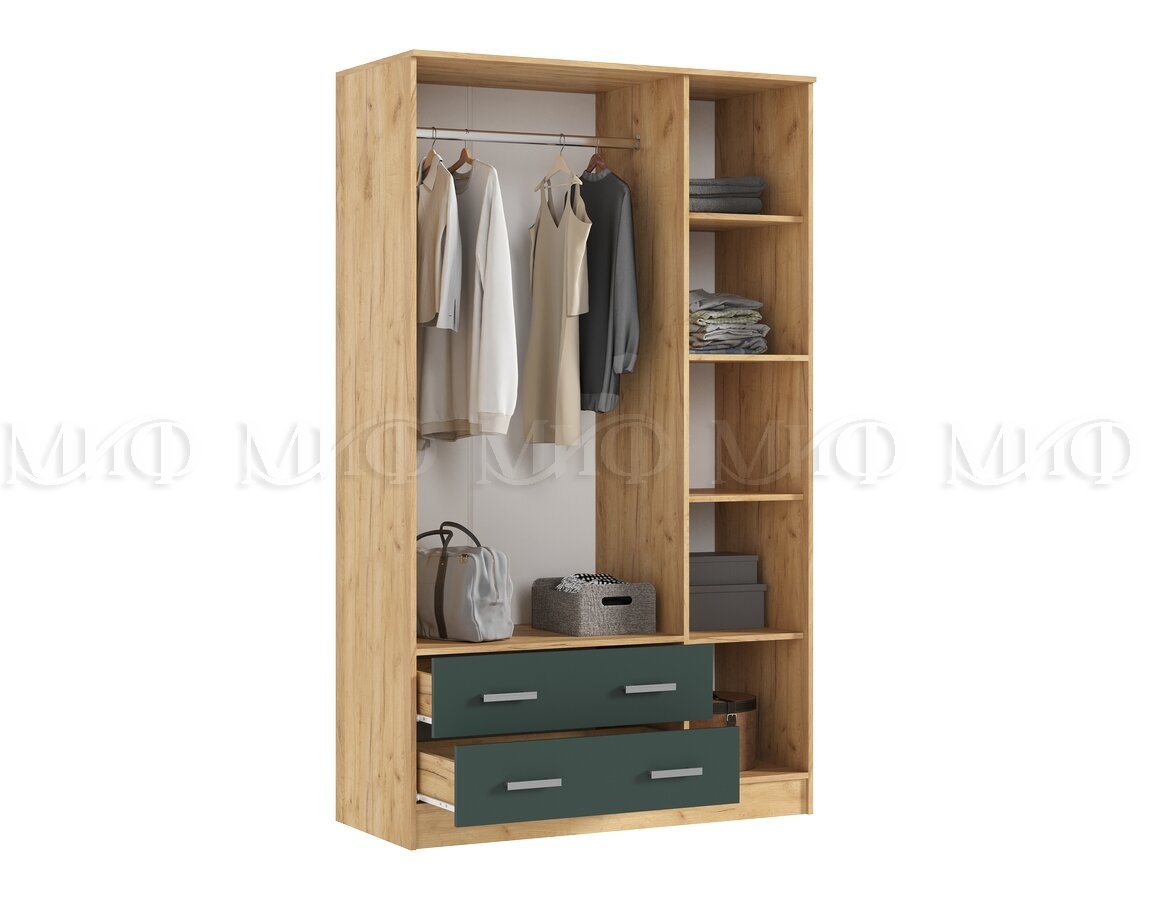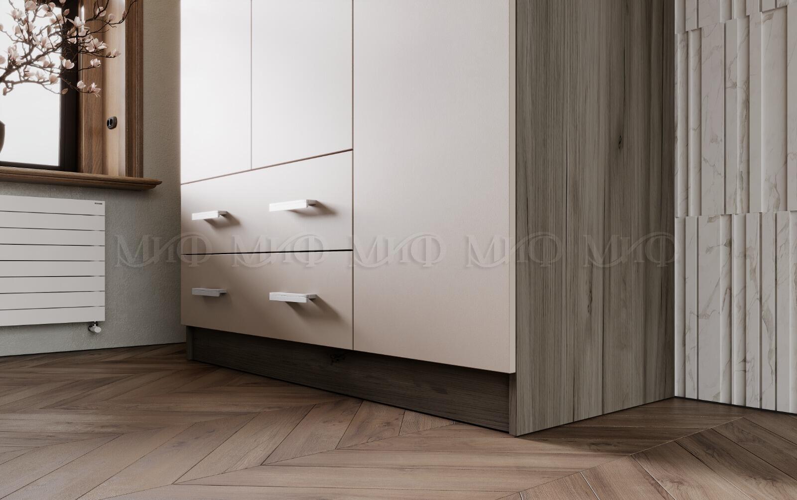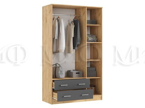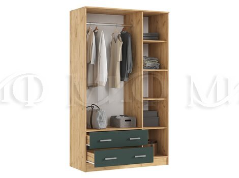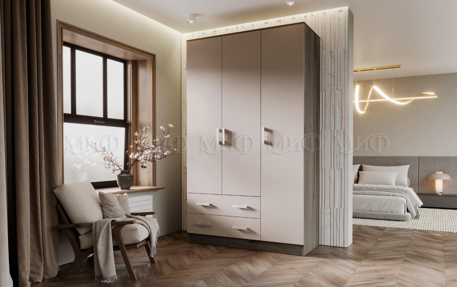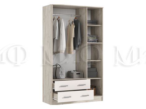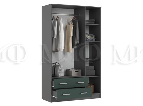 Распашной шкаф с выдвижными ящиками. Выполнен в обычном дизайне. Имеет два отделения: одно предназначено для верхней одежды, другое представляет собой стеллаж для постельного белья и прочих вещей.