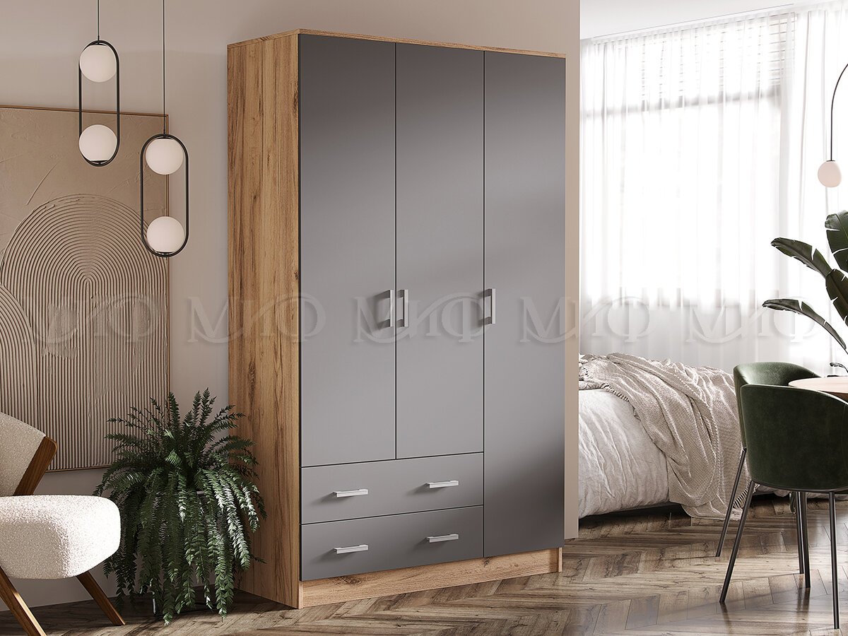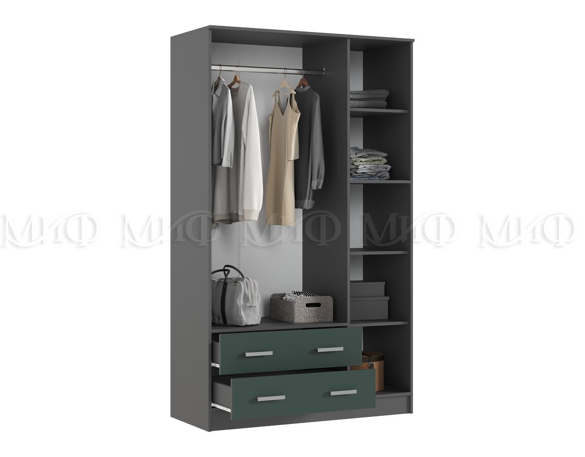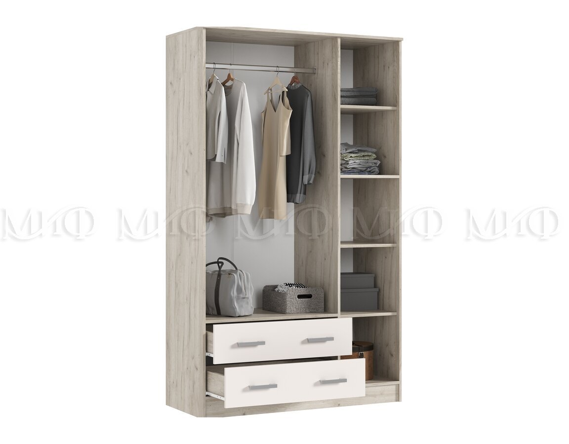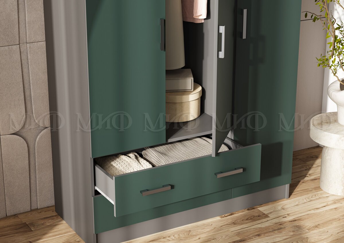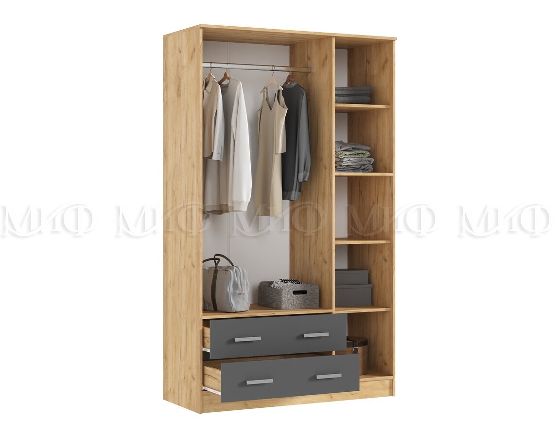 Распашной шкаф с выдвижными ящиками. Выполнен в обычном дизайне. Имеет два отделения: одно предназначено для верхней одежды, другое представляет собой стеллаж для постельного белья и прочих вещей.