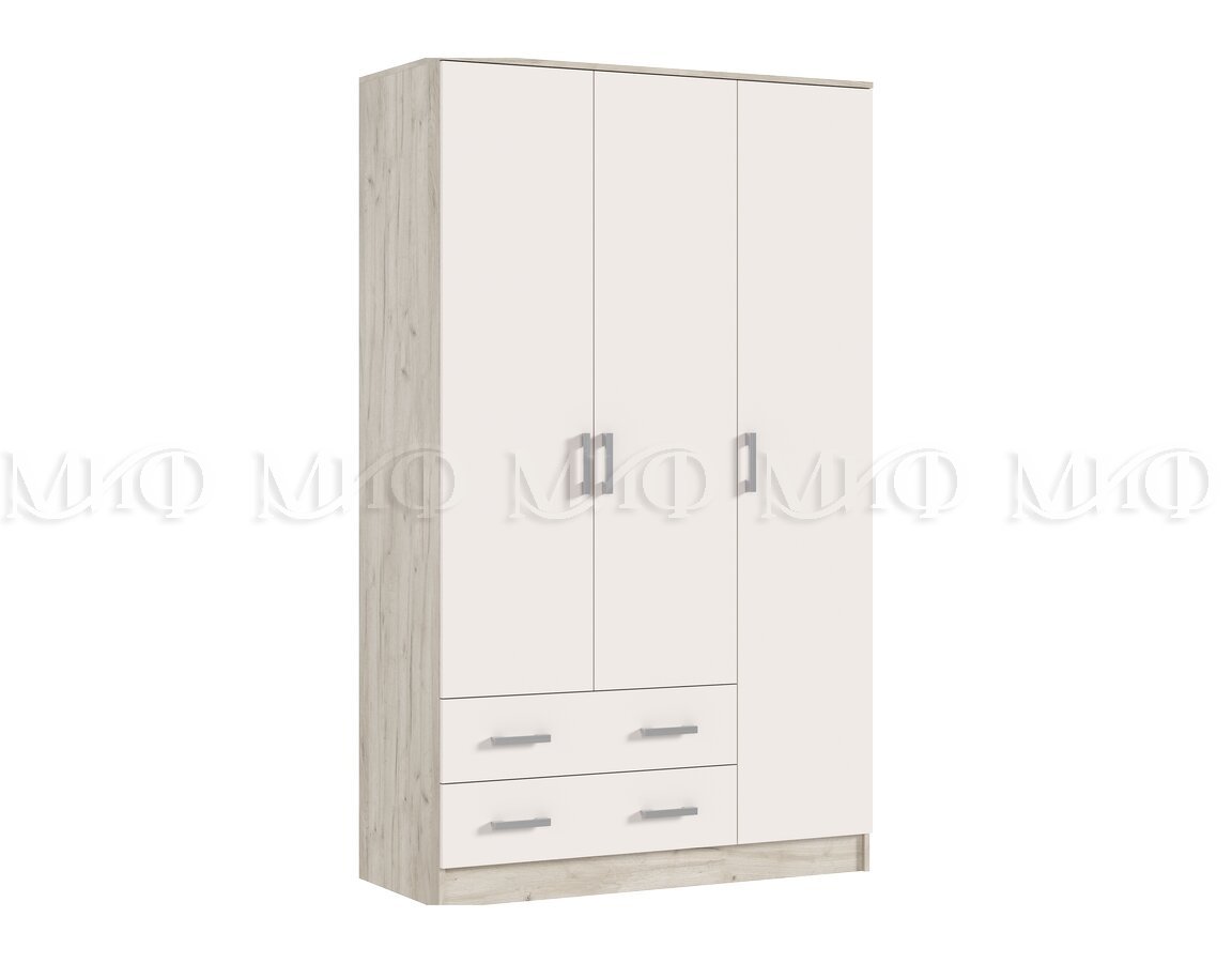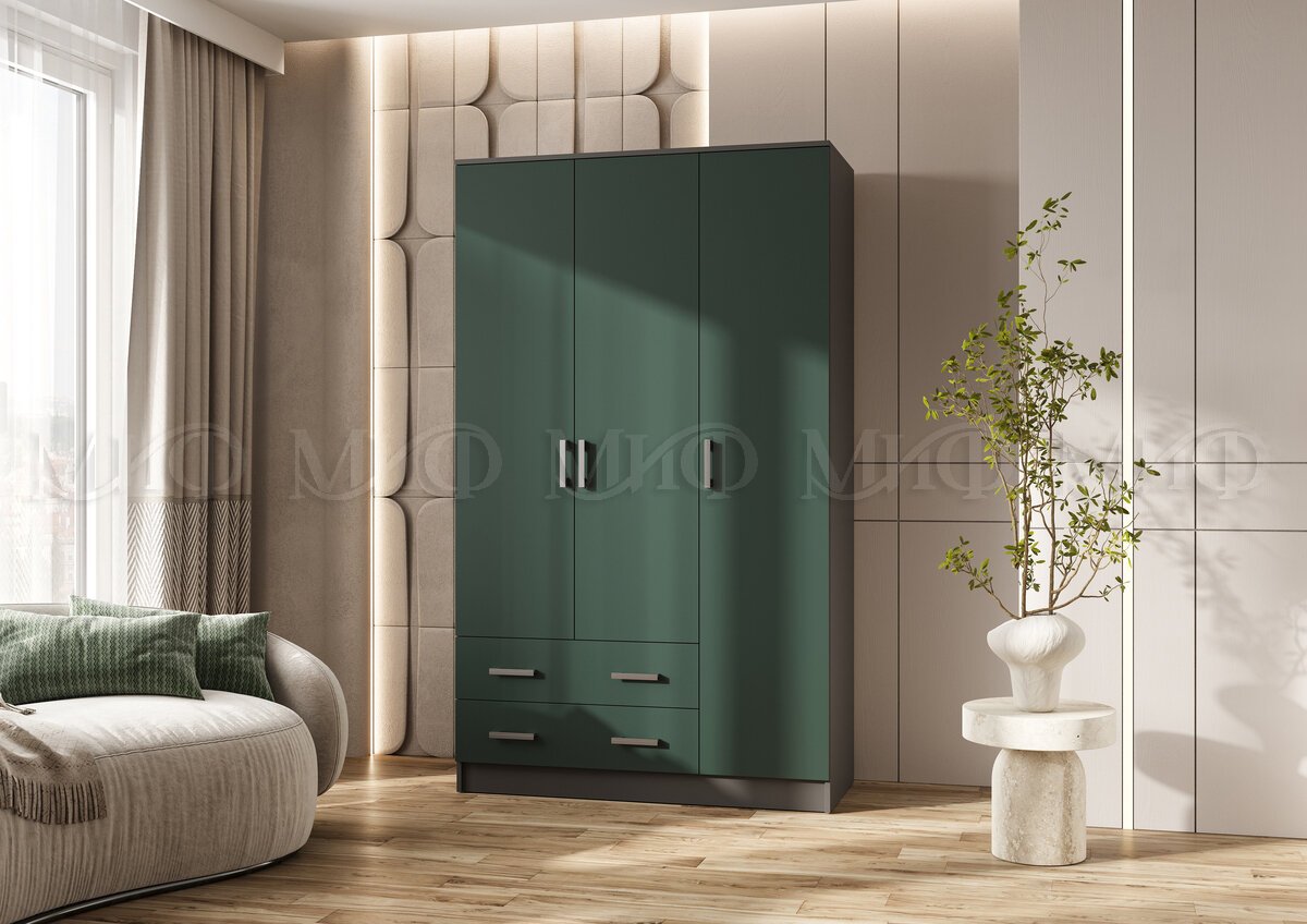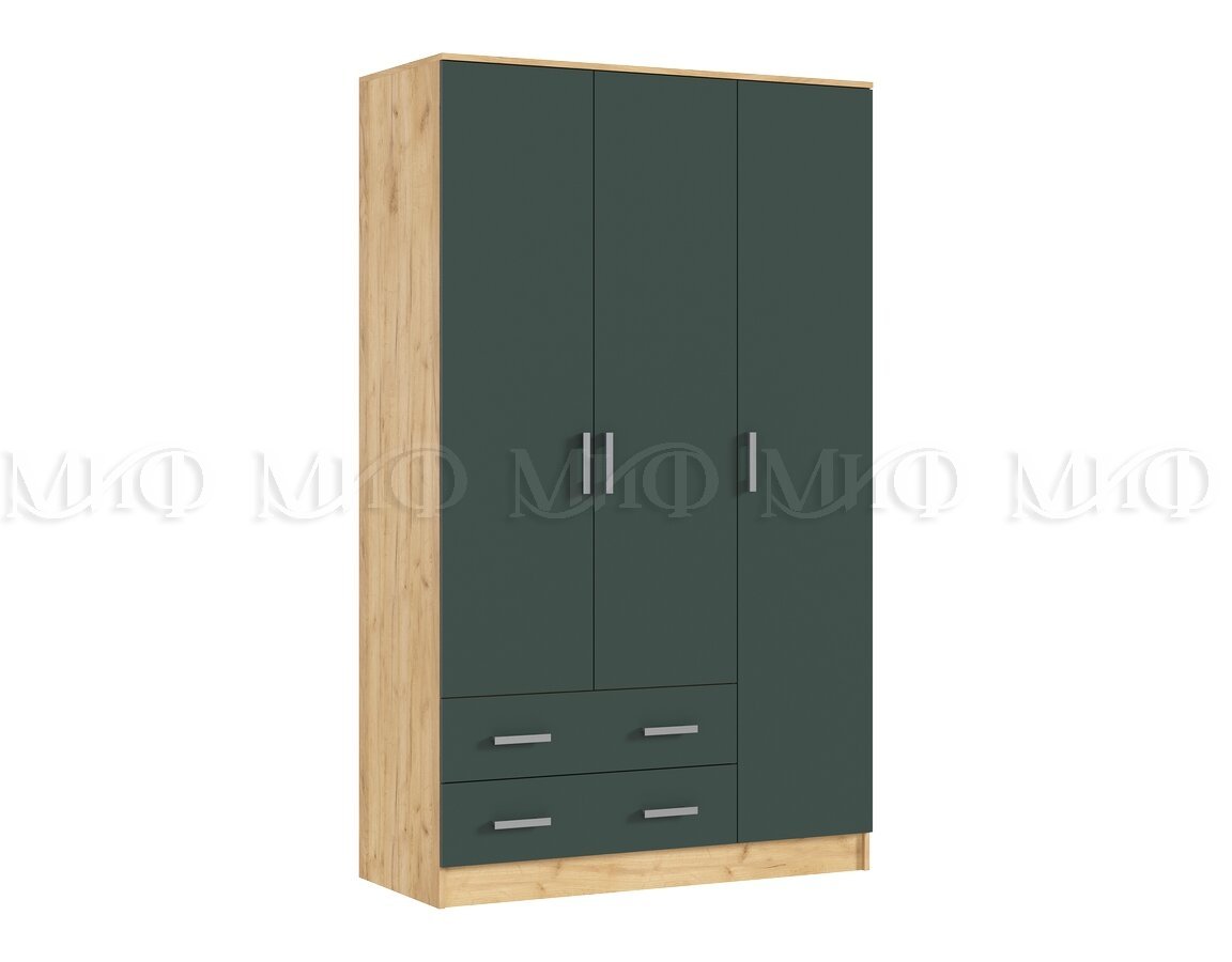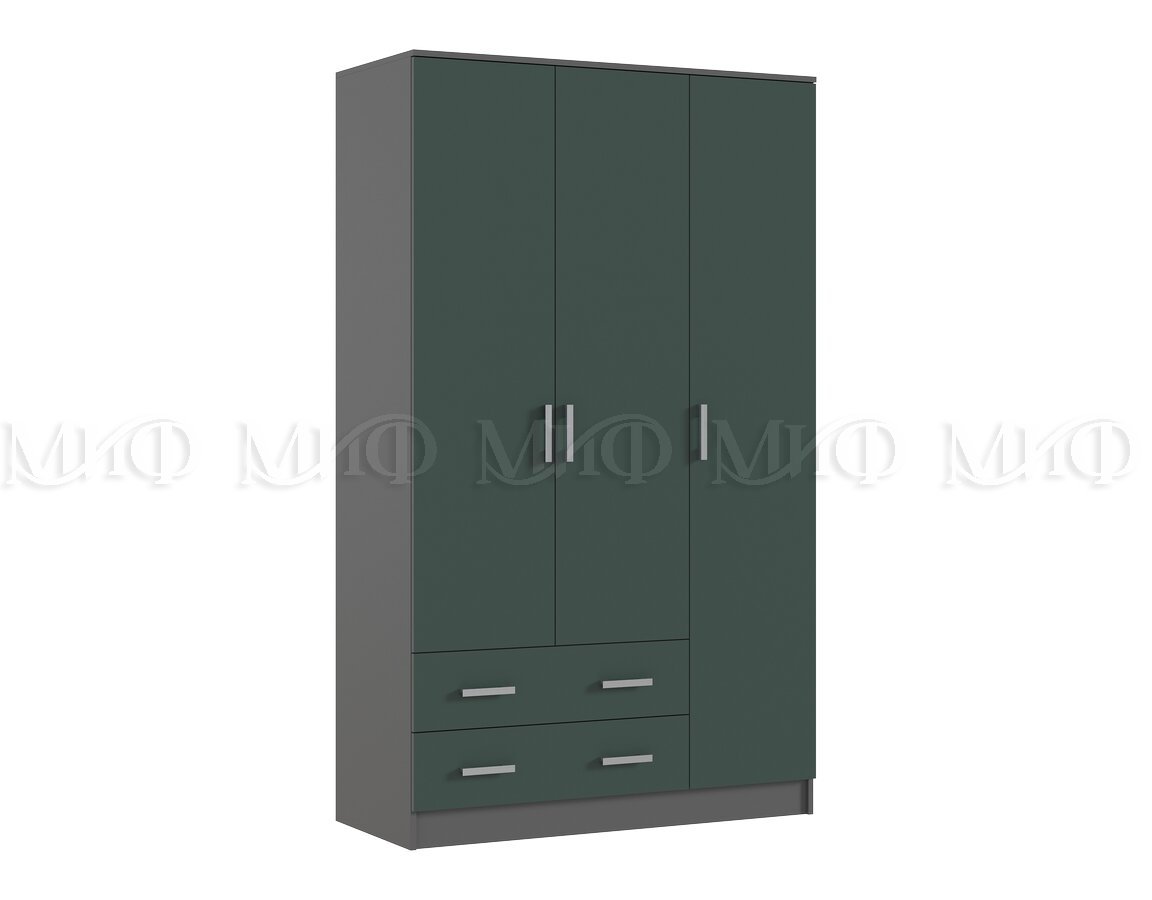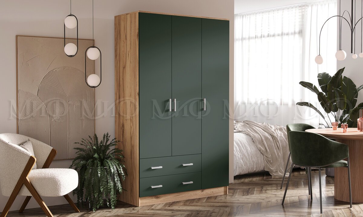 Распашной шкаф с выдвижными ящиками. Выполнен в обычном дизайне. Имеет два отделения: одно предназначено для верхней одежды, другое представляет собой стеллаж для постельного белья и прочих вещей.